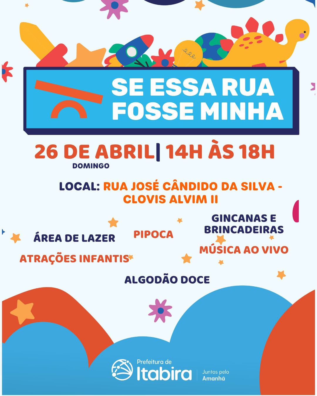 A rua José Cândido da Silva, no bairro Clóvis Alvim II, será palco de uma tarde de lazer, cultura e integração comunitária neste domingo (26), das 14 às 18 horas, com a realização do Se Essa Rua Fosse Minha, promovido pela Prefeitura de Itabira, por meio da Secretaria Municipal de Esporte Lazer e Juventude (SMELJ). A programação foi pensada, principalmente, para famílias, crianças e adolescentes da região.